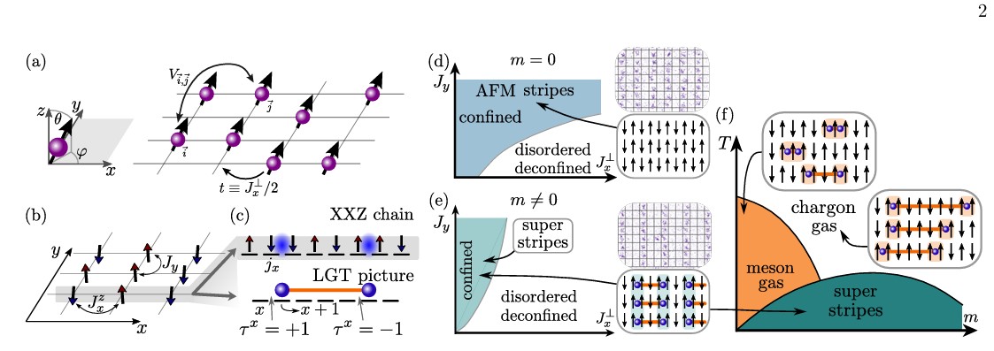 Confinement of particles into bound states is a phenomenon spanning from high-energy to condensed matter physics, which can be studied in the framework of lattice gauge theories (LGTs). Achieving a comprehensive understanding of confinement continues to pose a major challenge, in particular at finite matter density and in the presence of strong quantum fluctuations. State-of-the-art quantum simulators constitute a promising platform to address this problem. Here we study confinement in coupled chains of \(Z_2\) LGTs coupled to matter fields, that can be mapped to a mixed-dimensional (mixD) XXZ model. We perform large-scale numerical matrix-product state calculations to obtain the phase diagram of this model, in which we uncover striped phases formed by the \(Z_2\) charges that can be melted at finite temperature or by increasing the tunneling rate. To explore this setting experimentally, we use our quantum simulator constituted by erbium atoms with dipolar interactions in a quantum gas microscope, and observe the predicted melting of a stripe phase by increasing the particle tunneling rate. Our explorative experimental studies of thermal deconfinement of \(Z_2\) charges motivate our further theoretical study of the mixD \(Z_2\) LGT, in which we predict a confined meson gas at finite temperature and low magnetization where thermal fluctuations destroy stripes but enable spontaneous commensurate spin order. Overall, we demonstrate that our platform can be used to study confinement in \(Z_2\) LGTs coupled to matter fields, including long-range interactions and beyond one dimension, paving the way for future research of confinement in the quantum many-body regime.